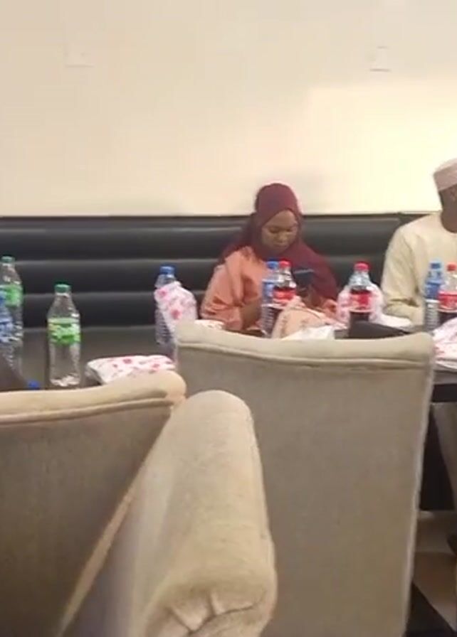 A group of people are seated around a long, dark table in what appears to be a restaurant. The table is covered with bottles of water, soda, and paper bags. Some of the people are wearing traditional hats. At least one person is looking at their phone. A sign that says "Ice Cream" is visible on the wall. The camera is static and provides a slightly obstructed view of the scene.