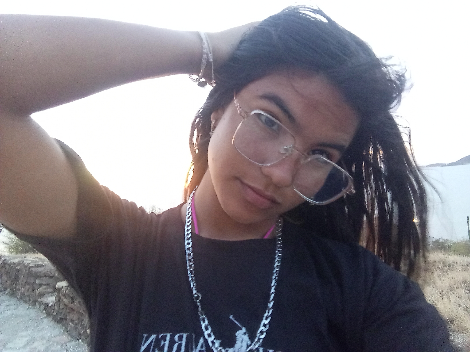 A selfie photograph shows a person with dark hair and glasses looking directly at the camera. The person wears a black shirt with an upside-down white logo, a silver chain necklace, and a bracelet on their raised arm. A pink strap, likely from a bathing suit, is visible. The background features dry vegetation and a low stone wall, suggesting a rural or semi-rural setting. The sky is bright, indicating daylight. Considering the reference to Juan Griego, Venezuela, the environment could be located in or around the outskirts of the city, where dry vegetation is common. The photo seems to be taken outdoors, with the subject standing on the edge of an area that overlooks vegetation.