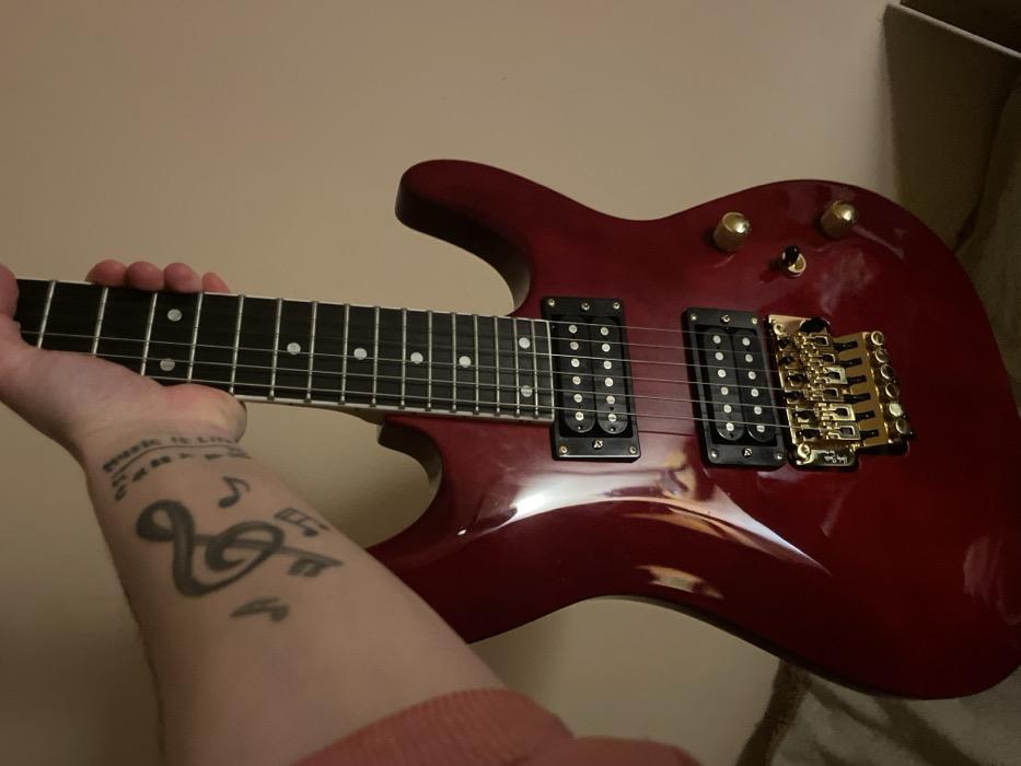 The scene depicts an indoor environment, with the location stated as Stara Zagora, Bulgaria, though no visual elements within the image confirm this geographical information. A person's left forearm and hand are prominently featured, gripping the neck of a dark red electric guitar. The forearm, partially covered by a peach-toned long-sleeved garment, displays several tattoos: a large black treble clef symbol, various smaller black musical notes (including eighth and sixteenth notes), and partially legible text reading "music is my..." positioned above the treble clef. The electric guitar features a glossy dark red finish on its double-cutaway body. It has a dark-toned fretboard equipped with circular white fret markers. The instrument is fitted with two black humbucker pickups, each featuring exposed pole pieces, a gold-colored Floyd Rose-style tremolo bridge system, and three gold-colored rotary control knobs along with a small black toggle switch located on its body. The person's left hand is positioned on the guitar's neck, with the thumb visible on the rear of the neck. The background consists of a plain, light beige wall. In the lower left foreground, a blurry, textured surface, possibly a couch or upholstered furniture in a tan or olive-green hue, is partially visible. The lighting suggests an artificial, warm light source.
