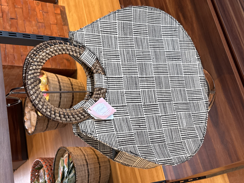 A woven handbag is prominently displayed on a dark brown wooden surface within a retail setting, characteristic of a souvenir or handicraft shop in Panglao, Philippines