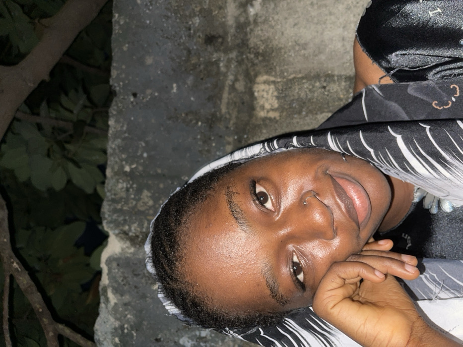 A person with dark skin and short, dark hair is smiling slightly and looking up toward the camera. They have a nose ring in their left nostril. The person is wearing a black and white patterned headscarf and a dark-colored garment. Their right hand is near their chin. The background includes a concrete wall and some green foliage.