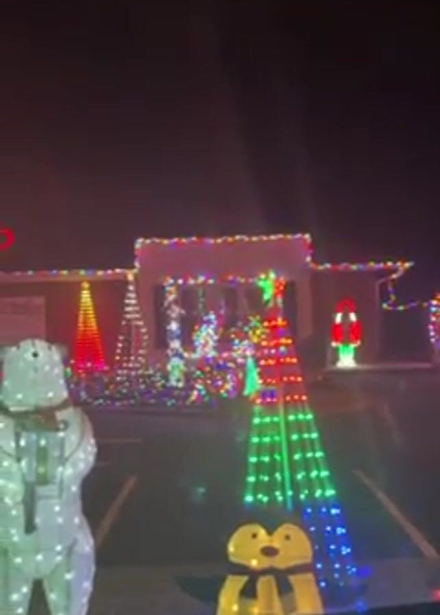 At night, a house is brightly illuminated with colorful Christmas lights and decorations. A large "Merry Christmas" sign in red neon is displayed on the roof. The house is also decorated with a string of lights along the roofline and various light-up figures, including a polar bear, a penguin, and multiple Christmas trees of varying colors. The decorations cover the lawn and facade of the building. The video appears to be taken from inside a vehicle.