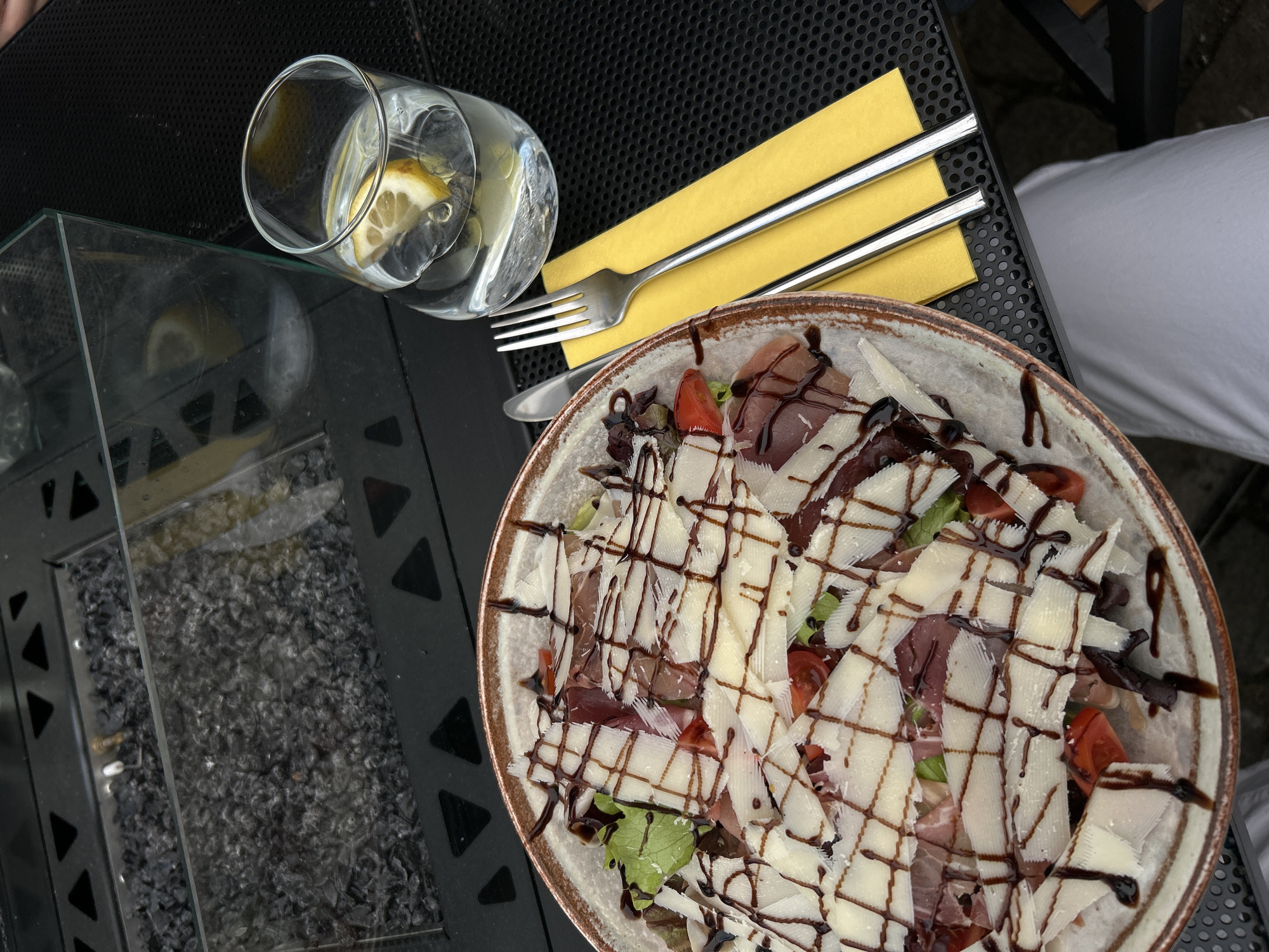 A top-down view shows a table setting, likely in an outdoor dining area. The table is black with a perforated surface. A glass of water with ice and a lemon slice sits to the left, next to a decorative fire pit that contains black decorative rocks. A yellow napkin is placed near the upper center of the image, and a fork and knife lie on it. To the right, a bowl filled with salad is visible. The salad contains lettuce, tomatoes, prosciutto, and parmesan shavings, and is drizzled with a dark balsamic glaze. A portion of a person's leg, clad in white trousers, is visible in the upper right corner. This suggests the photograph was taken from the perspective of someone seated at the table. The location is in Plovdiv, Bulgaria.