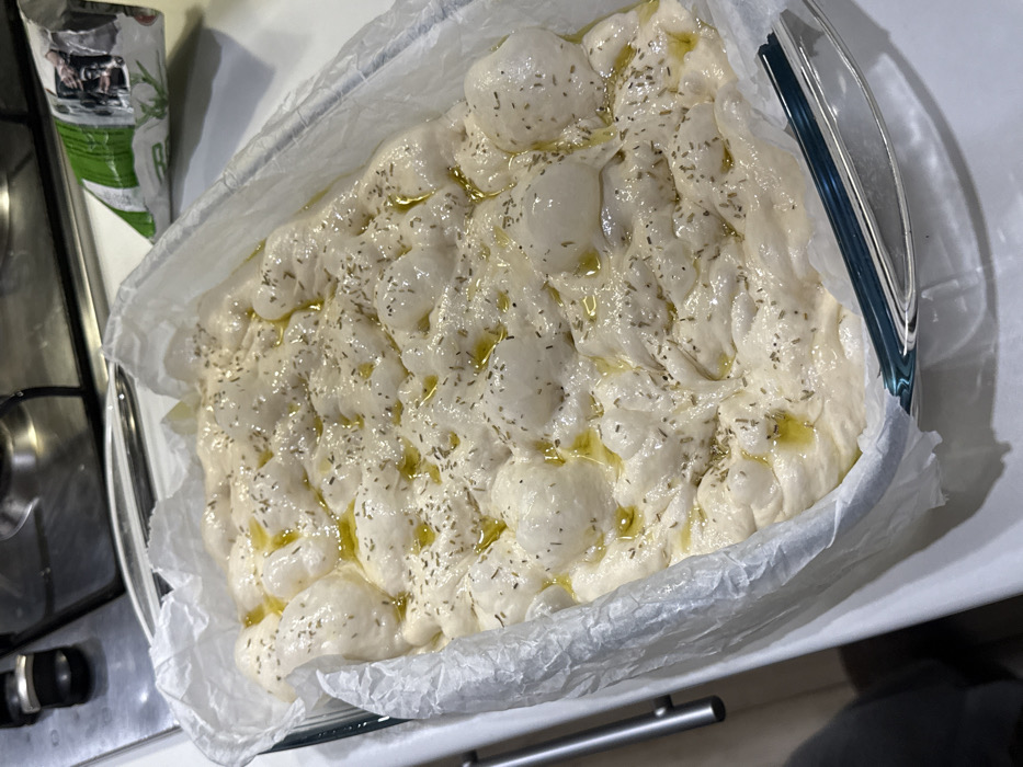 A clear glass rectangular baking dish, lined with crumpled white parchment paper, is centrally positioned on a white countertop. Within the dish, raw focaccia dough, characterized by its pale, risen, and dimpled surface, is visible. The dough is extensively covered with clear golden-yellow olive oil, forming small pools in the depressions, and uniformly sprinkled with dried green herbs. In the upper left background, a portion of a stainless steel gas cooktop with black grates is discernible. To the right of the baking dish, a crumpled green and white package, possibly food-related, rests on the countertop. The environment suggests a kitchen setting in the city of Dobrich, Bulgaria. No individuals are present.