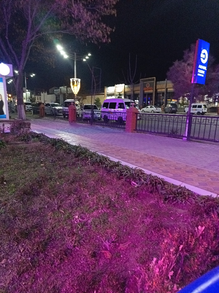 A nighttime scene displays a street with multiple cars parked along the roadside. A white van stands out among them. The street is lined with a low fence, behind which are various buildings with illuminated signs. Streetlights add brightness. A patch of greenery in the foreground appears purple-tinged. A tall tree stands to the left. The overall lighting creates an ambiance of dusk.