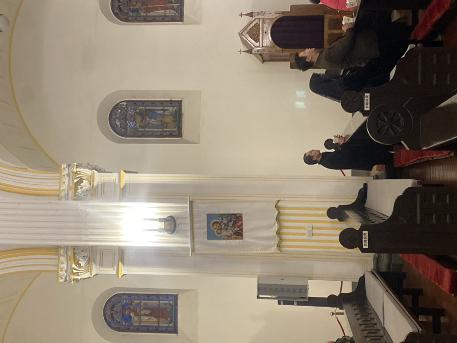 The interior of a church in Qing Dao Shi, China, located at the coordinates 36.068, 120.315. The image shows a white-walled interior with arched ceilings. There are two stained-glass windows on the right wall, with figures depicted in them. A large pillar is in the center of the image, with a white banner with a painting of Mary and Jesus hanging on it. The pillar is decorated with yellow-and-white stripes at the bottom. Wooden pews are in the foreground, with two people kneeling in prayer. One person is wearing a black jacket and the other a black dress. The church floor is wooden, and there are red carpets in front of the pews. A wooden stall with a brown curtain is in the background, on the right side of the image. There are several people in the background on the right, sitting and praying. The pews are labeled in Chinese, with the text "请随意坐" (Please feel free to sit).