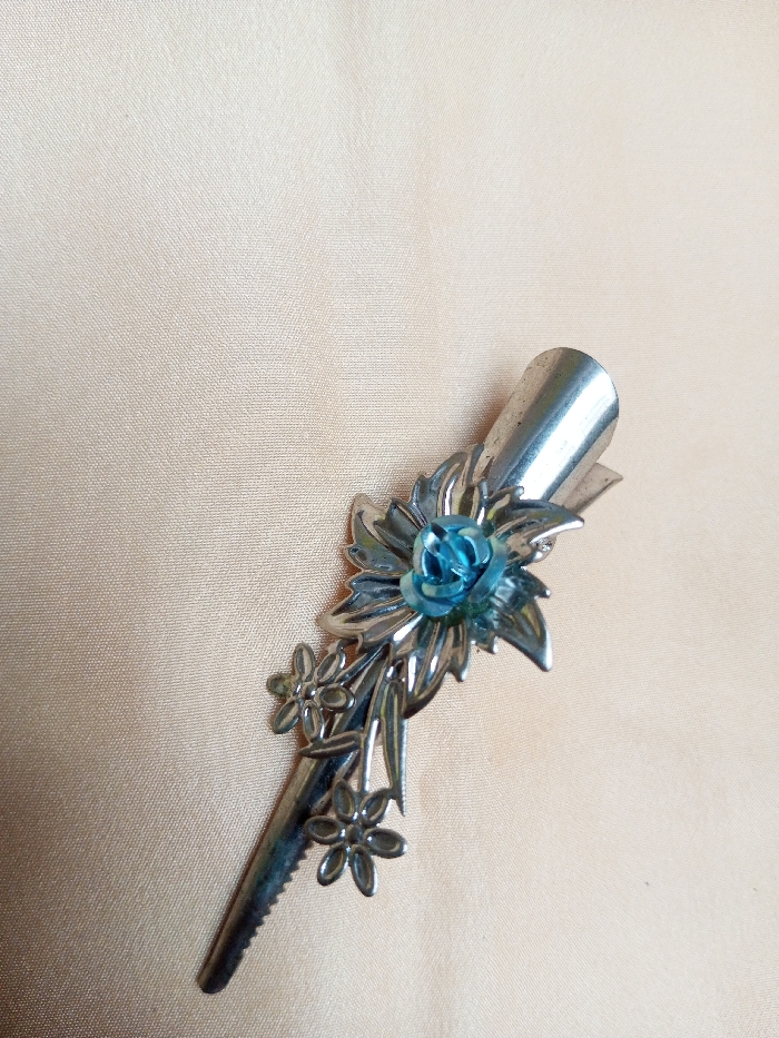 A single metallic hair clip is depicted at an oblique angle, positioned from the lower-left to the upper-right of the frame. The item is silver-toned, approximately 8-10 cm in length, and features an embossed floral design. A central element consists of a small, molded, turquoise-blue rose, surrounded by larger silver-colored leaves and petals. Below this main motif, a cluster of smaller, simpler silver-colored flowers and leaves extends along the clip's body. The bottom section of the clip exhibits a serrated edge, consistent with a hair-gripping mechanism. The object rests on a flat, light beige textile surface with a subtle weave texture. The scene lacks any human presence or discernible action, and is situated within Qarabucaq qəsəbə, Azerbaijan.