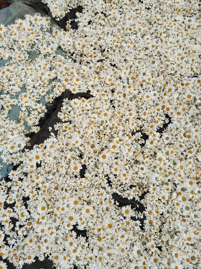 - "Thousands of small white flowers with yellow centers, consistent with chamomile, are densely scattered across a dark, textured surface, possibly a drying mat or tarp" by FM-KDvS93, licensed under CC BY 4.0