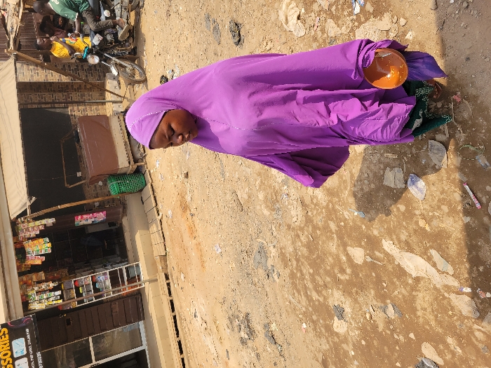 The image depicts a daytime street scene in Awka, Nigeria. In the foreground, a woman walks towards the viewer's right, looking downwards. She is clad in a purple head covering and a loose-fitting, long purple garment that covers most of her body. Her left hand holds an empty, light brown, concave bowl. A patterned green garment is visible beneath the purple outer layer. The ground is unpaved, composed of dirt and dried mud, with scattered litter including plastic pieces and wrappers. Shadows are cast on the ground from the right side, indicating bright sunlight. In the mid-ground, to the left, is a storefront with a dark brown facade. A sign above the entrance reads "ACCESSORIES" in white text on a black background. The open doorway reveals shelving units inside, displaying various packaged goods. A white metal shelf unit stands just outside the shop, also holding products. Further to the right in the background, another structure with a fabric awning is visible. Several individuals are present: a man in a yellow shirt stands near a wall, and another man in a green shirt is seated on a silver motorcycle. The motorcycle is parked on the unpaved ground.