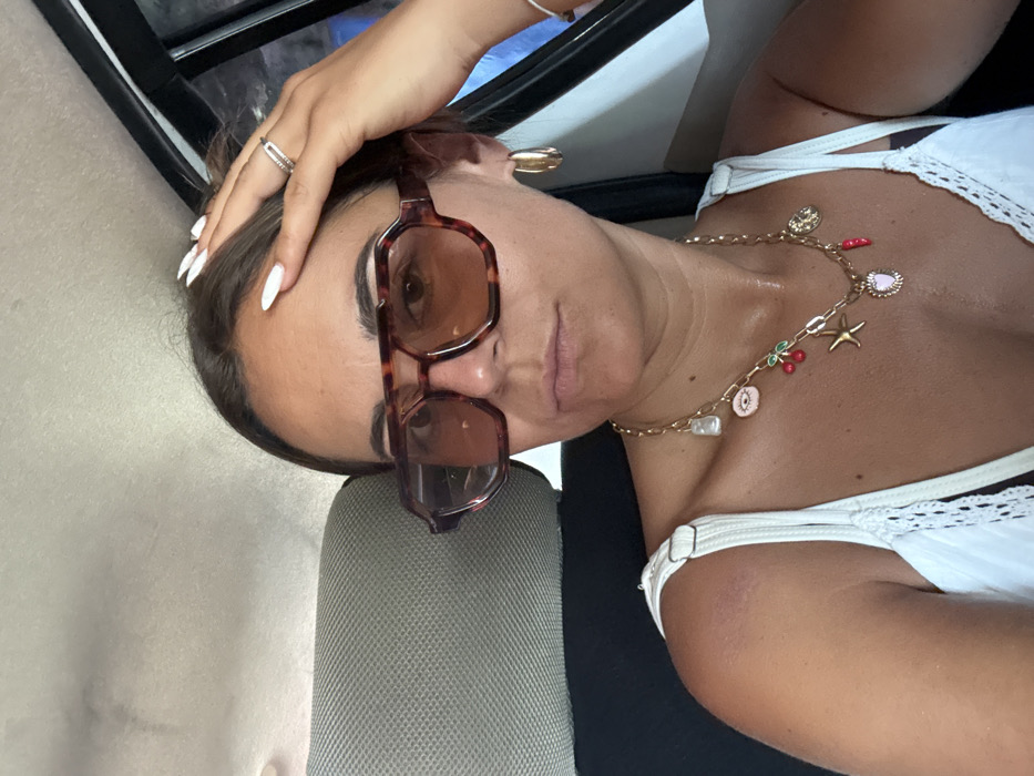 A woman poses close up, tilted to the right, wearing tortoise-shell sunglasses and a gold chain necklace with charms, including cherries, a starfish, and a heart. Her left hand rests on her head, displaying a silver ring and white manicured nails. She wears a white top with a lace trim, revealing part of her bare chest. The photo is taken from inside a car, with the headrest visible.
