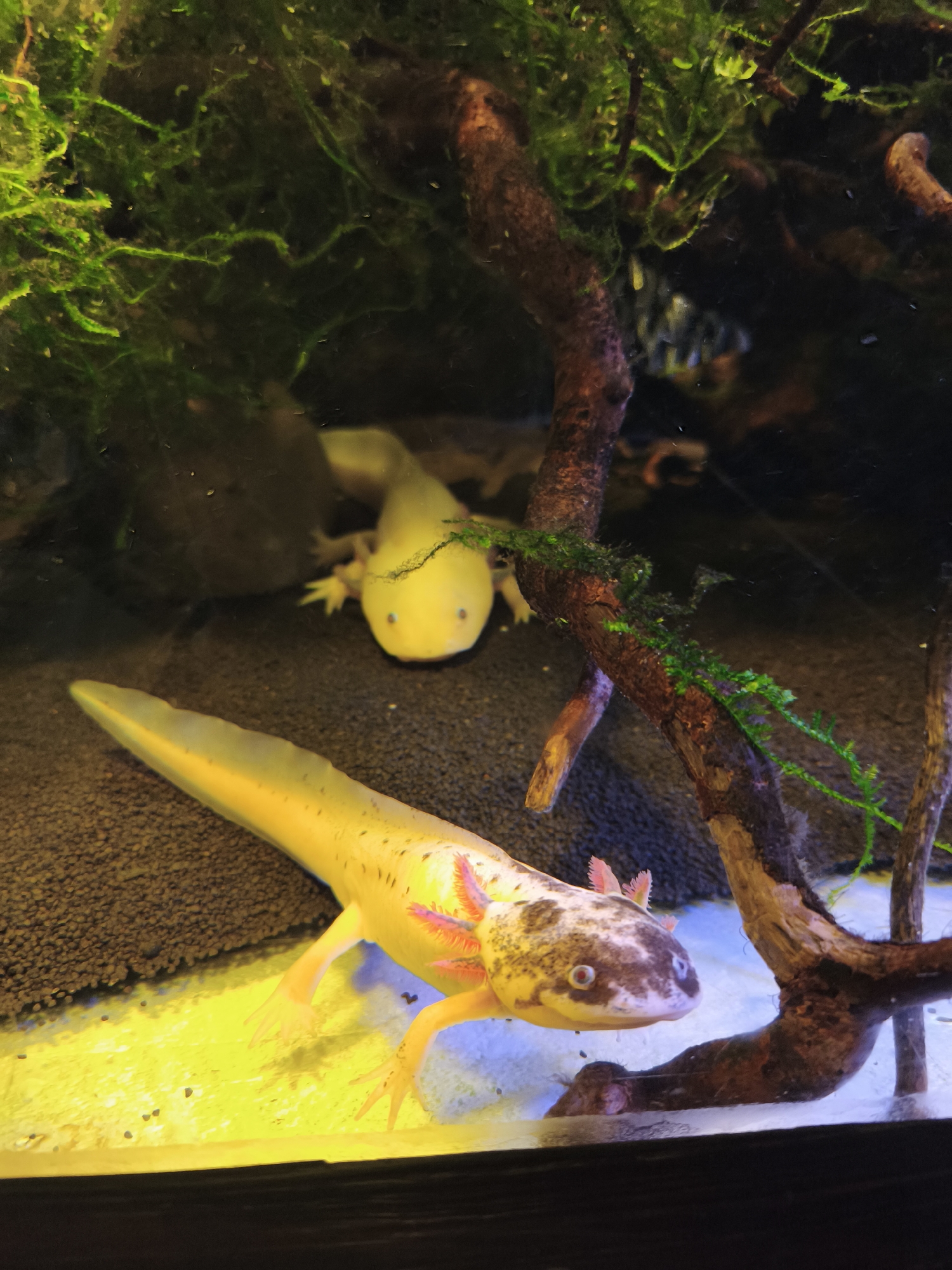The image depicts two axolotls in an aquarium