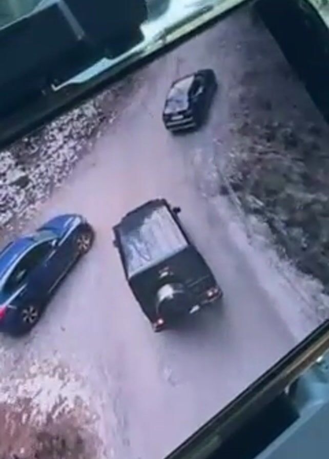 phone screen displaying a simulation of three cars driving on a dirt road with snow patches. The black SUV is in the foreground, a black sedan is ahead, and a blue car is off to the side. The phone is mounted in a car, visible in the background, and there's a blurred view outside the car window.
