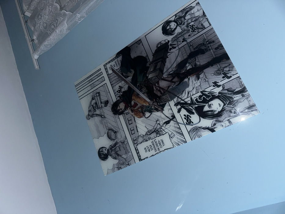 The image depicts an indoor scene within a building in Borovo, Bulgaria. A large, glossy rectangular print, displaying manga panels in predominantly monochrome tones with subtle color accents (e.g., a character's red scarf and green cape), is affixed to a light blue wall. The print features characters identifiable from the "Attack on Titan" series, including multiple depictions of Mikasa Ackerman with her distinctive red scarf and ODM gear, another character resembling Armin Arlert with a text bubble reading "OUR NEXT STEP DEPENDS ON EREN'S CONDITION!!", and a character resembling Erwin Smith in a lower-left panel. Several panels depict characters in dynamic action poses, including one central figure wielding a sword, and others on rooftops or in combat stances, accompanied by sound effect text such as "SLIP" and "FSSS". The wall meets a white ceiling at a crisp horizontal line. In the upper right quadrant, a white, intricately patterned lace curtain is visible, hanging from a thin rod near the ceiling. Reflections from an unseen light source are present on the glossy surface of the print and the wall.
