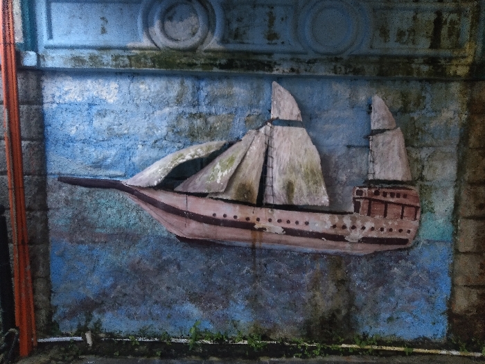 The image displays a weathered, three-dimensional relief sculpture of a sailing ship affixed to a painted concrete wall
