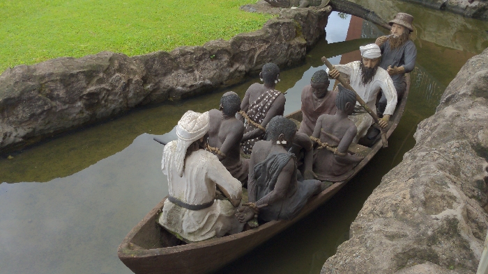 This image displays a historical diorama located within the Arusha Declaration Museum in Arusha, Tanzania. The scene features eight human figures in a dark wooden canoe-like boat on a narrow, shallow waterway. The waterway is flanked by sculpted grey rock formations; a patch of vibrant green grass is visible on the left bank, and the water appears murky green-brown. Six figures are positioned within the boat, depicting individuals in transit. Five of these figures are dark-skinned, largely bare-chested or wearing minimal wraps (one with a patterned cloth wrap), and are shown with their hands bound by ropes, suggesting captivity. One dark-skinned figure has small white earrings. A sixth figure, lighter-skinned and dressed in white robes and a turban, sits at the front, facing away from the viewer. At the rear of the boat are two lighter-skinned, bearded male figures. One, wearing a white shirt and turban, holds a long wooden pole, poised as if propelling the boat. The other, dressed in a dark hat and dark clothing, stands behind him, holding a pipe to his mouth. Both rear figures face forward.