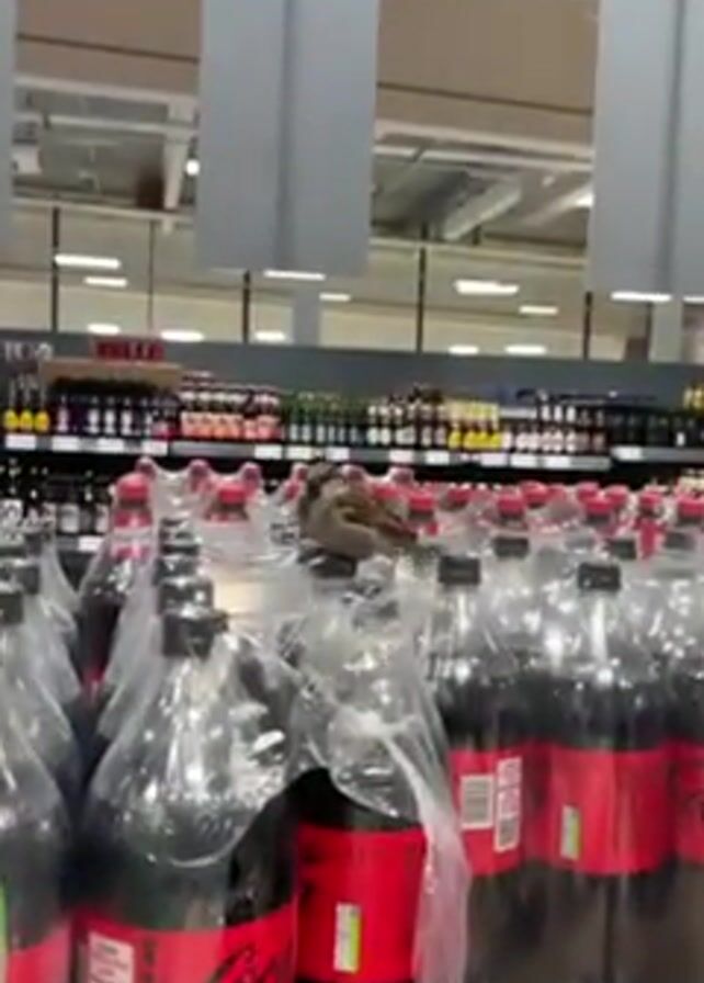 rows of Coca-Cola bottles in a supermarket, covered in clear plastic wrap. A small brown bird is perched on top of the bottles. The camera moves around the display, showing more bottles and rows of alcoholic beverages on shelves in the background. The store has bright overhead lighting and gray signage.