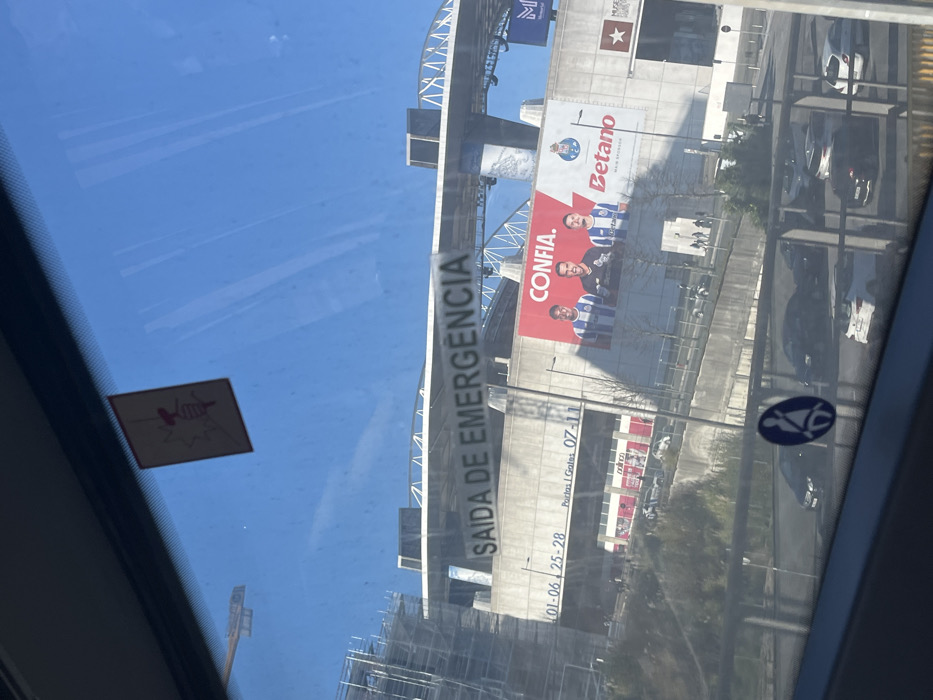 The image captures a sunlit outdoor scene in Porto, Portugal, viewed from inside a vehicle through a slightly obstructed window. The primary subject is the Estádio do Dragão, identifiable by its architecture and signage. In the foreground, adhered to the vehicle's window, is a small, rectangular, reddish-brown sticker depicting a stylized syringe. Lower on the window, a circular blue and white sticker shows a person wearing a seatbelt. The glass surface exhibits reflections and streaks of dirt. The Estádio do Dragão dominates the midground, presenting as a large concrete and steel structure. A prominent white sign across its upper facade reads "SAÍDA DE EMERGÊNCIA" (Emergency Exit). Below this, gate information is displayed, including "Portas | Gates 07-11," "01-06," and "25-28." A large billboard on the stadium's exterior features three male football players in blue and white FC Porto jerseys, accompanied by the FC Porto crest, the text "CONFIA.", and the sponsor name "Betano." Construction scaffolding is visible on the stadium's left side. In front of the stadium, a multi-lane roadway is populated with several passenger vehicles, predominantly black, white, and silver. A long, red and white commercial structure, possibly a mobile vendor, bearing the text "Mata," is positioned on an elevated terrace. A few pedestrians are visible on the walkways. The immediate environment includes an embankment with sparse, leafless vegetation. The background consists of a clear, bright blue sky devoid of clouds.