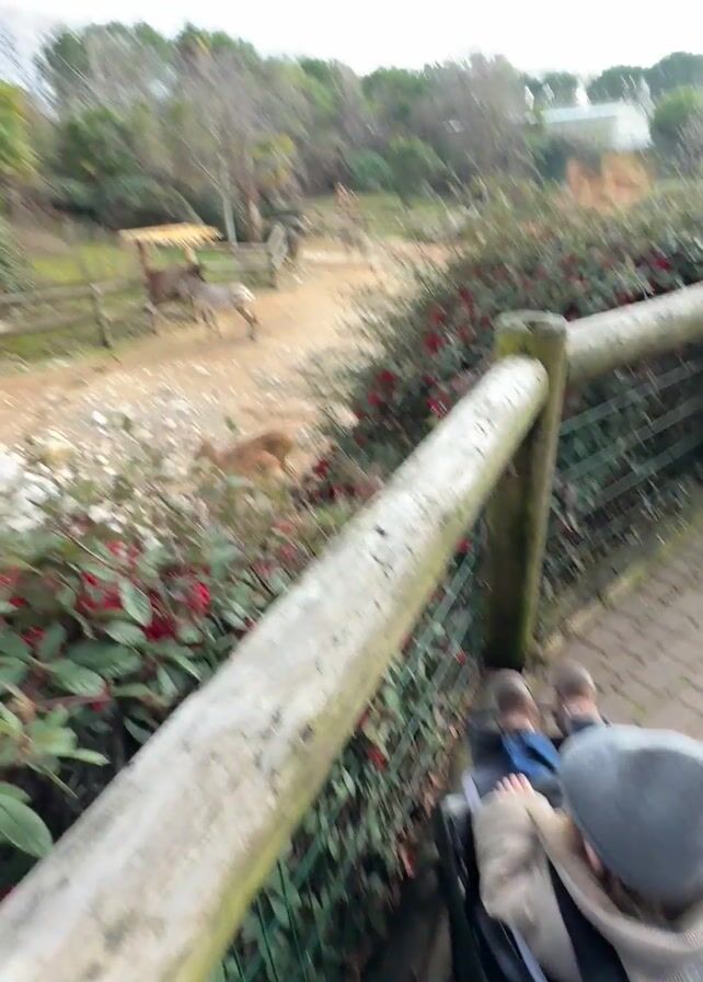 young child sitting in a stroller looking at zebras and deer in an enclosure. The child is wearing a beige jacket, blue jeans and a gray hat. The mother leans over the stroller, looking at the child. The animals are in a muddy area behind a wooden fence. There is a feeding trough in the enclosure. The video is taken from a slightly elevated position. The environment includes trees, plants and a paved pathway.