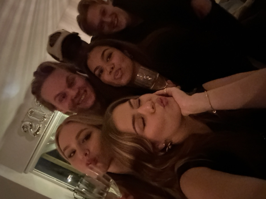 A group of six people pose close together in a tilted selfie. The bottom left woman with blonde hair holds a champagne glass near her lips. Behind her, a man with blond hair smiles. Above them, another woman puckers her lips. An arm with a bracelet is visible. In the top row, another man smiles while another person is only partially visible in a black hat. The background shows decorations and a white wall. The lighting appears dim.