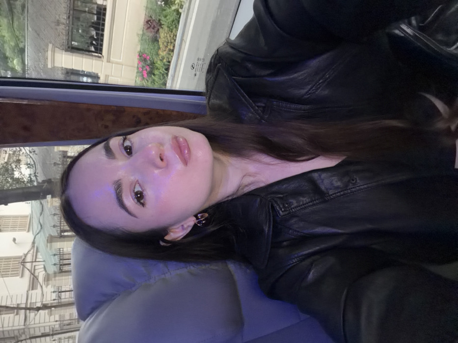 A woman with long brown hair and fair skin is captured in a close-up, angled shot. She is wearing a black leather jacket and appears to be reclining against a gray surface. The background features a blurred cityscape visible through a window, with buildings and greenery suggesting an urban environment. The image has a soft, diffused lighting, creating a relaxed and slightly glamorous ambiance.