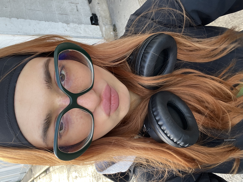 A female subject is depicted in a close-up, chest-up selfie, situated outdoors in the city of Pantin, France. The individual possesses long, wavy, reddish-brown hair and wears a black fabric headband. Large, dark green, oval-shaped eyeglasses with clear lenses are worn, reflecting ambient light. The subject's face features visible freckles and lips are puckered. Black over-ear headphones rest around the neck. A black hooded garment is partially visible, with a white element at the collar area. The background is out of focus, revealing a light-colored fence or wall on the left and a rough, grey concrete wall on the right, with a dark, indistinct object at its base. Paved ground is visible in the lower background. Natural daylight illuminates the scene.