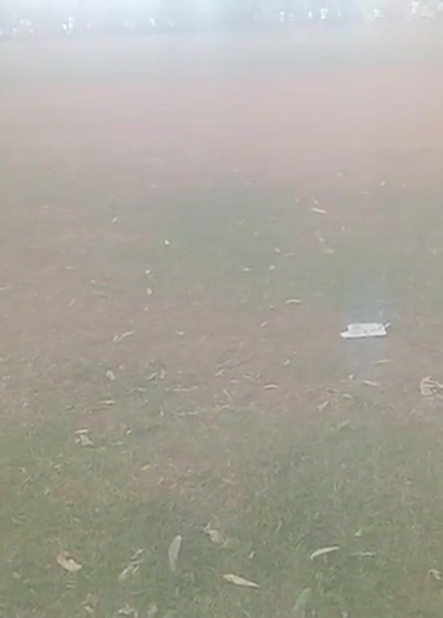 The video depicts a grassy field on a somewhat hazy day. At the far end of the field, there are several blurry figures that appear to be people. Nearer to the camera, there is a small, rectangular object lying on the grass. The video quality is not sharp, and the overall scene appears muted due to the haze.