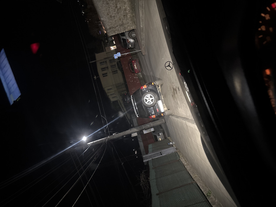 This image depicts a nighttime street scene in Svoge, Bulgaria, viewed from inside a vehicle looking forward through the windshield. The foreground shows the vehicle's dashboard and windshield, with a prominent Mercedes-Benz logo superimposed or reflected in the upper-center of the glass. The scene is illuminated by a bright streetlamp on a utility pole positioned on the left side of the road, casting strong light and a lens flare across the image. Numerous overhead power lines extend from this pole and across the dark night sky. A dark-colored SUV, possibly a Toyota RAV4 due to its rear-mounted spare tire, is parked on the left side of the street, partially on a paved sidewalk, facing away from the camera. To the left of the sidewalk, a chain-link fence encloses an unseen area. Further back on the left, behind the fence, another light-colored vehicle is partially visible. On the right side of the street, a red sedan is parked further down, followed by a silver hatchback parked perpendicular to the street, partially obscured by a stone wall. Two blue parking signs are visible near the silver hatchback. In the background, a multi-story building with windows is visible, illuminated by distant lights. No people or overt actions are discernible within the frame. The overall environment is an urban street at night with artificial lighting.