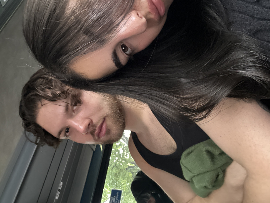 man and a woman seated in an interior space with a gray wall above their heads. The man is wearing a black tank top and a green shirt folded in his arms. He has short, brown, curly hair and a beard. The woman is leaning on the man's shoulder. She has long, dark hair that covers most of her face and is wearing a dark, loose-fitting shirt. Her eyes are visible, and she is looking towards the camera. The scene is framed by an open window with green foliage visible in the background. The coordinates (40.769, -74.024) indicate the location is in Weehawken Township, New Jersey, USA. The space they are in appears to be a bus, as there is a sign on the wall that reads "vice area for people".