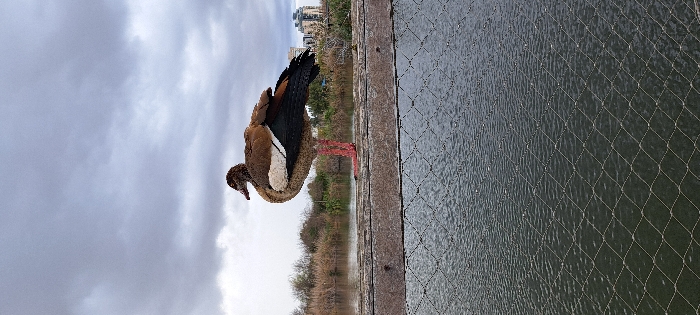 - "An Egyptian Goose (Alopochen aegyptiacus) stands balanced on its left reddish-pink leg, with its right leg lifted, atop a weathered wooden plank" by FM-053B42, licensed under CC BY 4.0