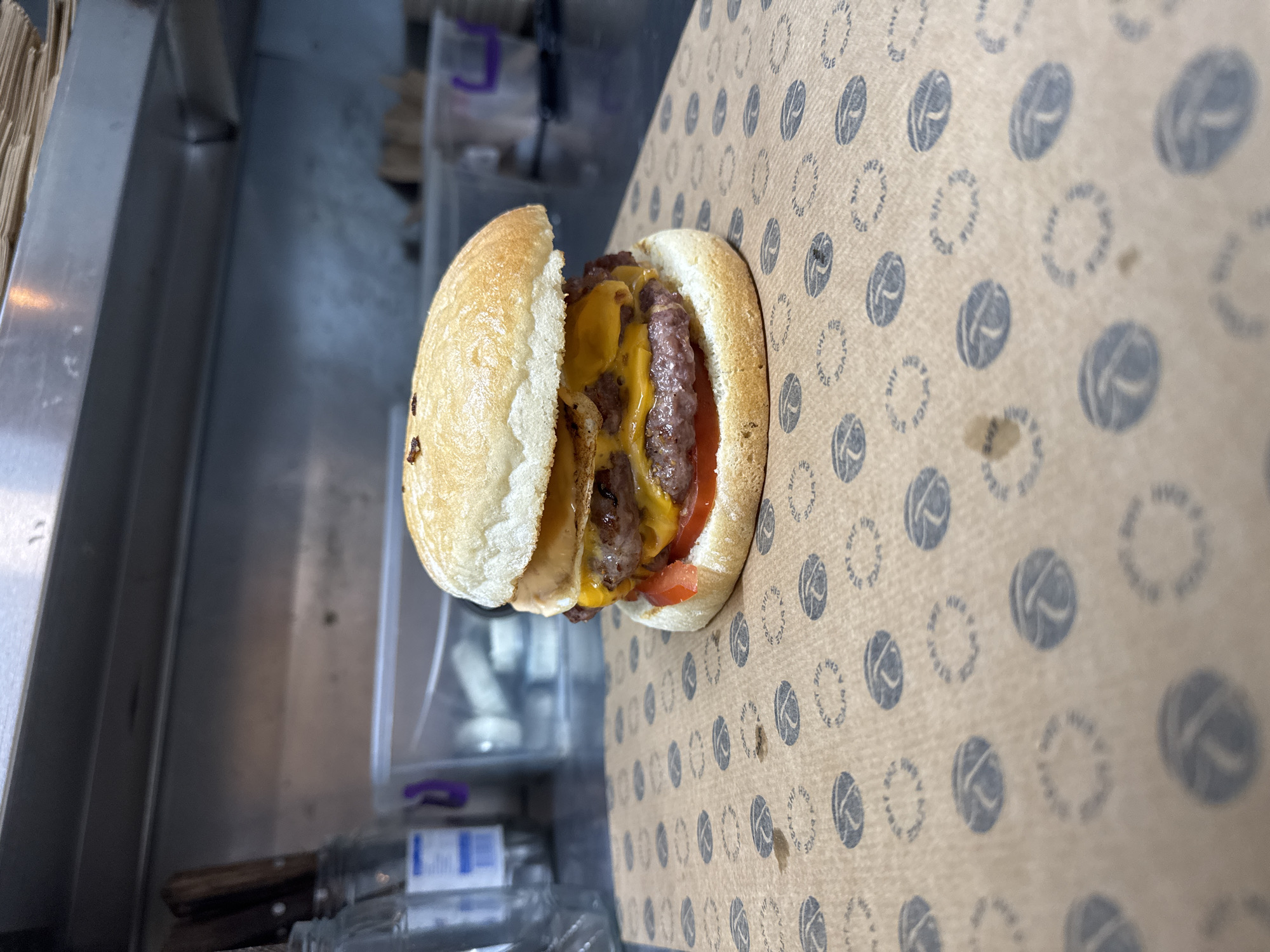 A medium shot, taken from above, shows a burger on brown paper. The paper is covered with a repeating pattern of a circle enclosing the letter "R", surrounded by text. The burger is stacked with a beef patty, melted cheese, and a slice of tomato between two halves of a bun. The burger is positioned on the right side of the frame. To the left, there is a steel surface with assorted items. The location is in the city of Unknown, Unknown.