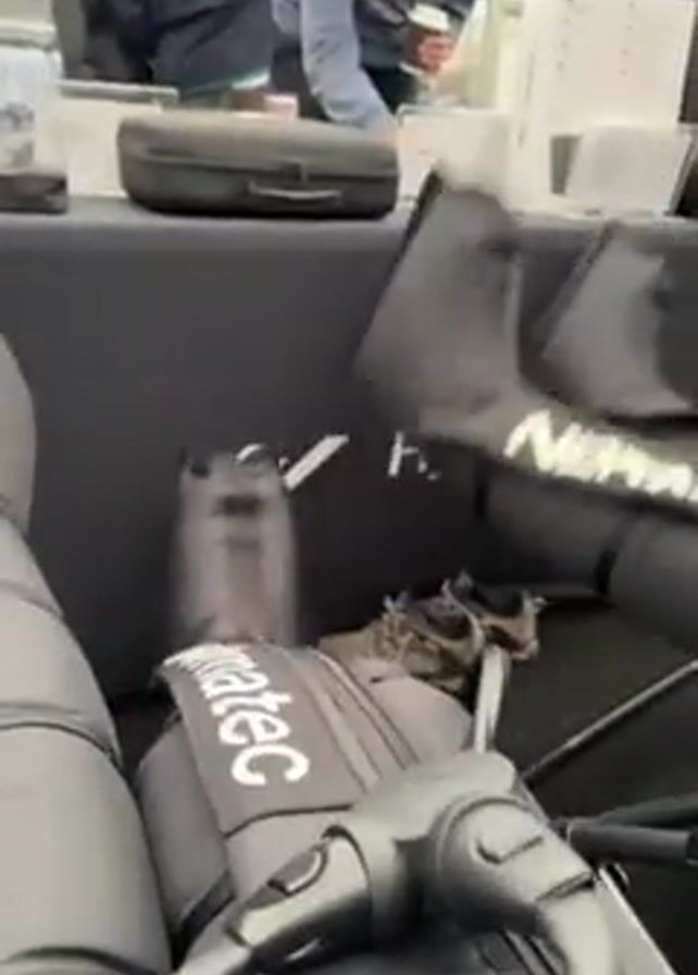 close-up of Normatec compression boots inflating and deflating on a table at what appears to be a public event