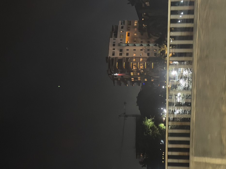 A nighttime cityscape reflects in rippling water, viewed from behind a textured barrier. A tall, light-colored building with illuminated windows dominates the skyline. A construction crane stands silhouetted against the night sky. Trees and street lights add to the urban ambiance. The overall scene is shrouded in darkness, with reflections providing the main source of illumination. A green light is visible in the sky.
