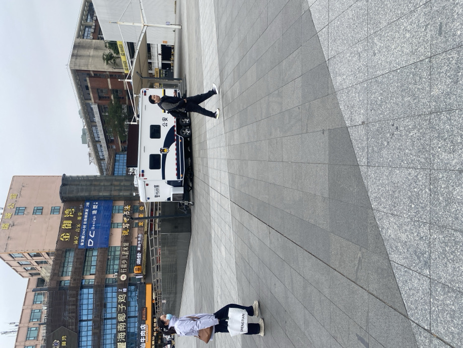 A public square scene shows two people on a stone-tiled area. One person is near a white police vehicle with Chinese characters and "POLICE" written on it. Another individual, wearing a face mask, stands farther away from the police vehicle, holding a handbag and a white shopping bag with the word "SHENGTIAN" printed on it. Multi-story buildings with Chinese signage, including “金御湾” and “星海南椰子鸡,” are visible in the background.