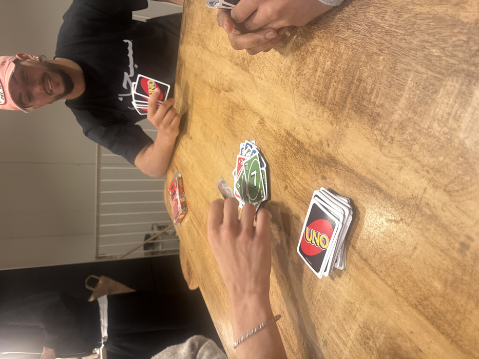 The image displays an indoor scene where at least three individuals are playing the card game UNO around a light-colored, heavily textured wooden table