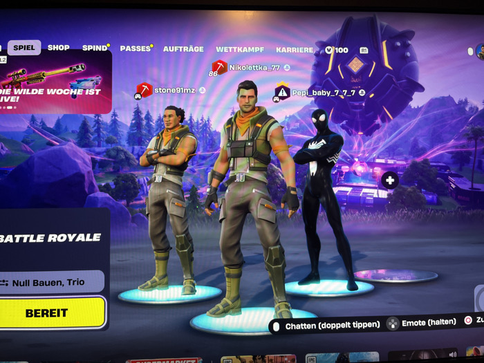 The image displays a television or monitor screen presenting the pre-game lobby interface of the video game Fortnite. The user interface is predominantly in German, featuring top menu options: "SPIEL" (Game), "SHOP," "SPIND" (Locker), "PASSES," "AUFTRÄGE" (Quests), "WETTKAMPF" (Competitive), and "KARRIERE" (Career). Three distinct player characters (skins) are visible, standing on illuminated circular platforms in the foreground. From left to right: 1. A male character with dark, curly hair, wearing an orange and grey tactical vest over a dark shirt, grey cargo pants, and yellow boots. His arms are crossed. Above him, the username "stone91mz" is displayed with a pickaxe icon and an "A" rating. 2. A male character with short brown hair, dressed in an identical orange and grey tactical vest and grey cargo pants with yellow boots. His arms are at his sides. Above him, the username "Nikolettka_77" is displayed with a pickaxe icon and an "86" rating. 3. A character in a full black Venom/Symbiote Spider-Man suit with a white spider emblem on the chest. His arms are crossed. Above him, the username "Pepi_baby_7_7_7" is displayed with a warning/alert icon. The in-game background depicts a stylized, mountainous landscape with purple and blue lighting, suggesting a fantastical or futuristic setting. Various glowing structures are visible, and a large, dark, spherical object with glowing accents hovers in the upper right background. On the lower left of the screen, a panel indicates "BATTLE ROYALE" and the game mode "Null Bauen, Trio" (No Build, Trio). Below this, a prominent yellow button labeled "BEREIT" (Ready) is visible. A promotional banner in the upper left section states "DIE WILDE WOCHE IST LIVE!" (The Wild Week is LIVE!) and features images of a gold-colored sniper rifle and a blue energy weapon. A control prompt bar at the bottom center of the screen offers "Chatten (doppelt tippen)" (Chat (double tap)) and "Emote (halten)" (Emote (hold)) options. This scene is displayed on a screen, and the physical location where this image was captured is identified as being within the city of Zurich, Switzerland. No specific details of the immediate physical surroundings within Zurich are discernible from the image itself.