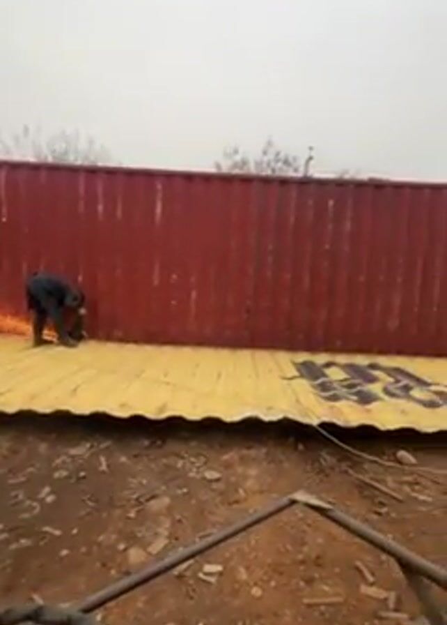 A man is cutting a red shipping container with a power tool that is creating sparks. The container is sitting on a yellow surface. He is wearing dark clothing and protective gear. The ground is dirt, and other shipping containers are visible in the background. The weather appears to be overcast.