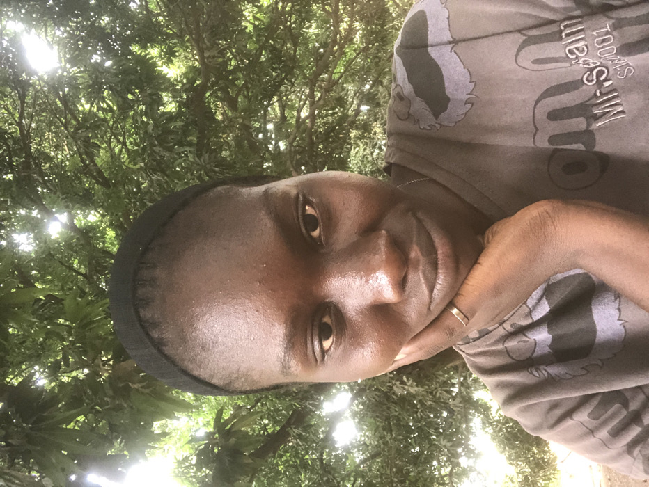 A headshot-style image depicts an adult female outdoors in Ninzo South, Nigeria. The subject has a dark complexion, is wearing a black headband, and a dark grey t-shirt with light grey patterns and partially visible text "Mr. Spam S/W 001." A plain gold-colored band ring is present on her left ring finger. Her left hand is raised, with fingers visible, supporting her chin. She maintains direct eye contact with the camera. The background consists entirely of dense green tree foliage, with bright sunlight filtering through the leaves, indicating an outdoor setting under a canopy.