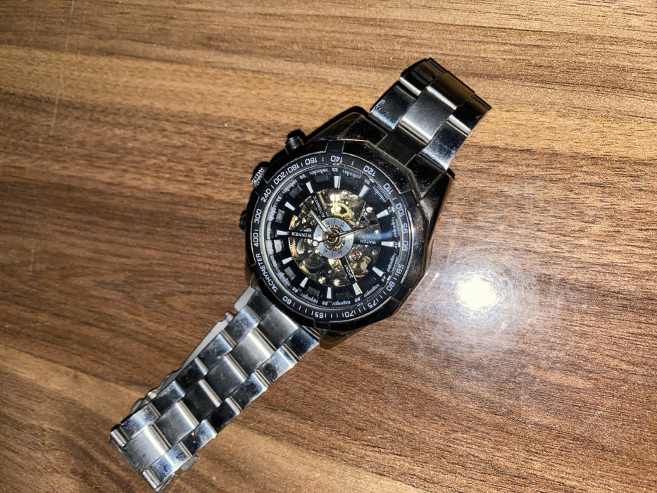 A silver watch lies on a wooden surface. The watch has a black dial with intricate mechanical details visible through the face. Markings such as "TACHYMETER," "WINNER," "WATCH," and "SPORT" are printed on the dial. The band appears to be made of silver metal links. The watch's position on the wood is slightly diagonal, with a bright spot reflected on the surface behind it.