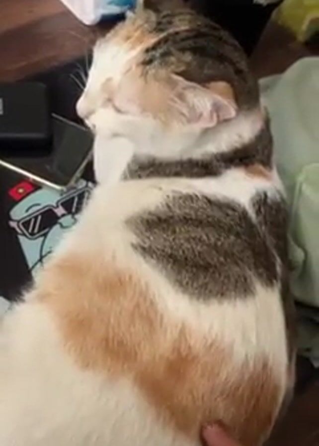 A close-up, top-down shot shows a calico cat lying still on a desk or table