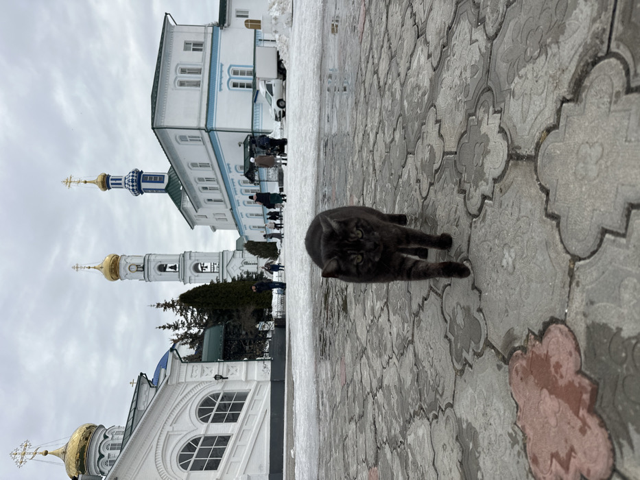 A low-angle photograph captures a dark grey domestic short-haired cat walking towards the viewer on a grey interlocking paved surface within the courtyard of Raifa Bogoroditsky Monastery in Местечко Раифа, Russia