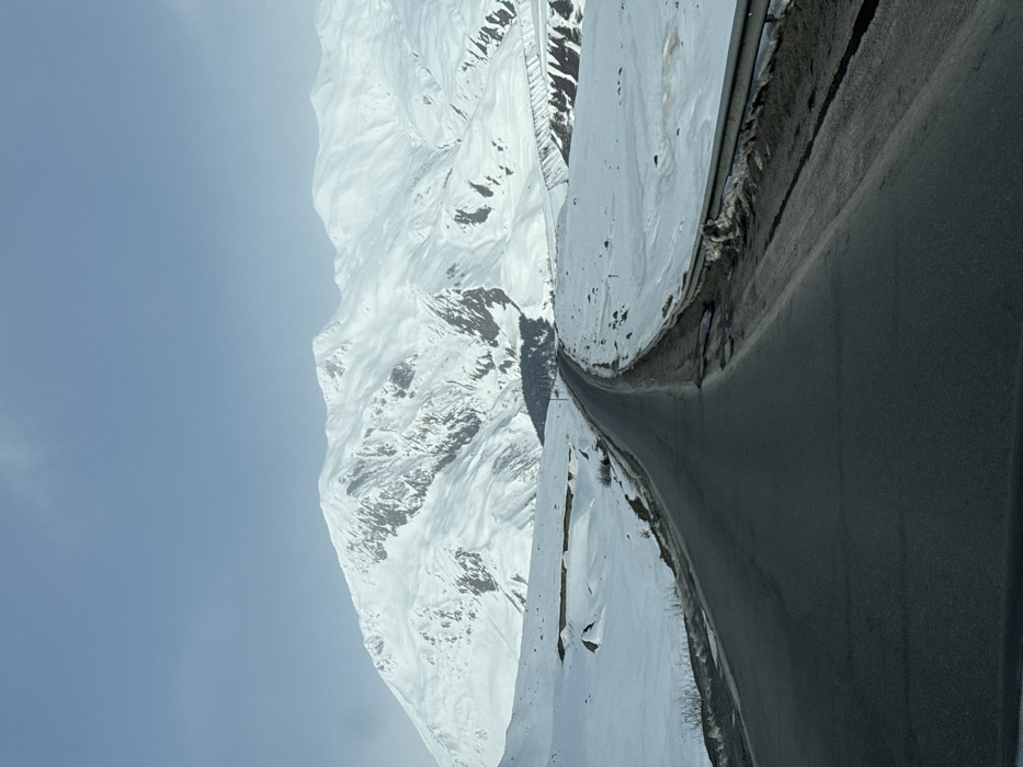 The image depicts a straight, two-lane asphalt road leading into the distance, ascending slightly towards a mountainous landscape, specifically located in Sioni, Georgia. The road surface appears generally clear, with some minor dark patches and irregularities visible along its right edge where it meets a metal guardrail. Both sides of the road are covered in significant amounts of snow, forming gentle slopes and drifts that extend into the midground. In the midground, the snow-covered terrain features undulating hills, with patches of darker, exposed earth or rock visible in some areas. A small cluster of dark evergreen trees is discernible on the left side, further down the road's path, and a single utility pole stands vertically near the road, also on the left. The background is dominated by an expansive range of high, rugged mountains completely blanketed in white snow. The mountain slopes show variations in texture, with some areas appearing smooth and others exhibiting more defined ridges and valleys, suggesting rock formations beneath the snow. The sky above the mountains is a clear, pale blue, with no discernible clouds. There are no individuals, vehicles, or animals visible in the scene, and no overt actions or interactions are depicted. The overall environment suggests a cold, winter setting.