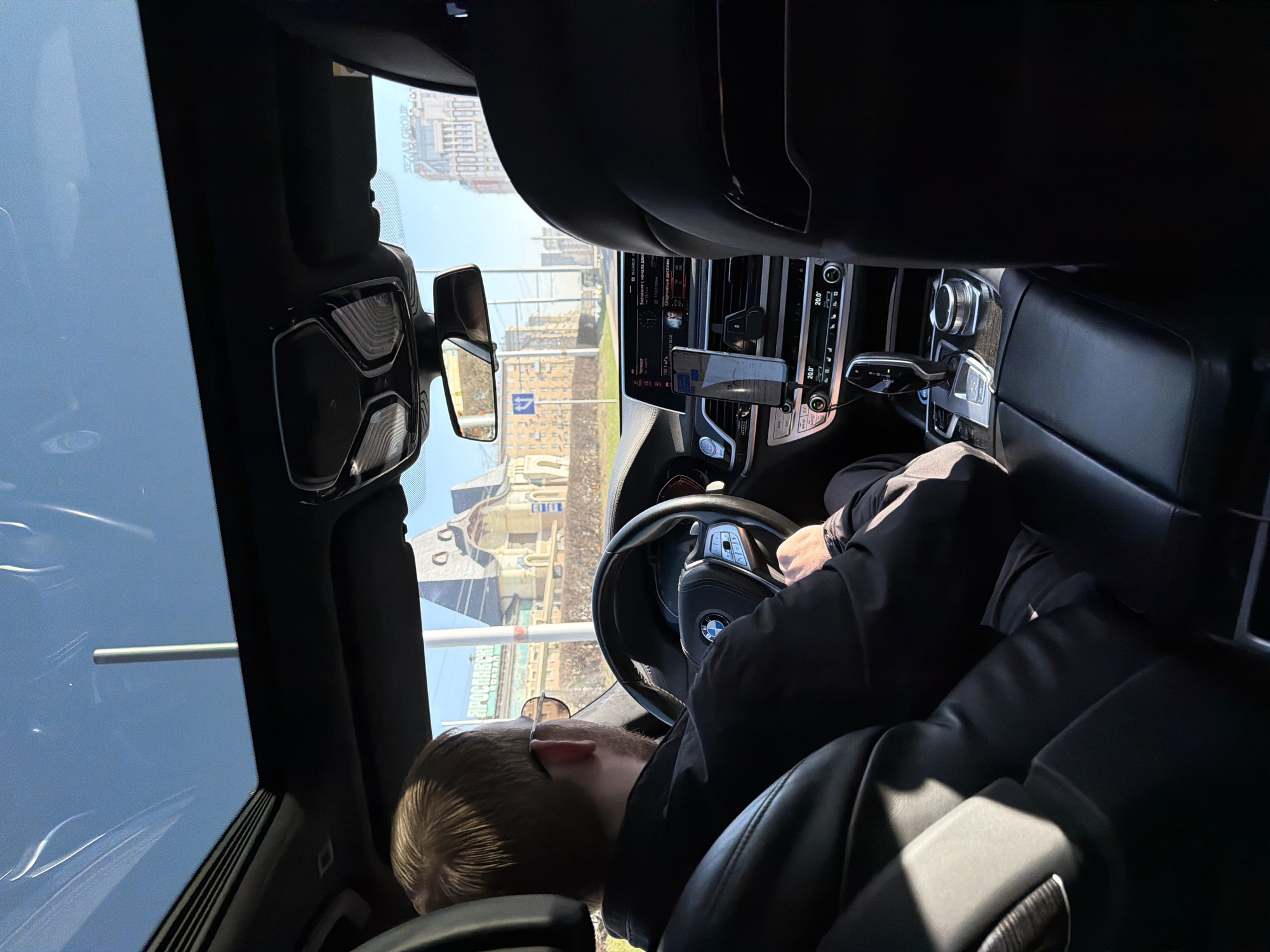 The image depicts the interior of a dark-colored vehicle, likely a BMW due to visible branding on the steering wheel, viewed from the rear passenger seat looking forward. A male driver, with light-colored hair and wearing glasses, is positioned in the driver's seat, operating the steering wheel with both hands. He is wearing a dark jacket or shirt. The vehicle features a panoramic sunroof, a dashboard with an infotainment display, climate controls set to 20.0 degrees Celsius, and a gear selector lever. A smartphone is mounted on the dashboard, displaying a map or navigation application. Through the front windshield, a city street in Moscow, Russia, is visible under a clear blue sky. On the left side of the road, the distinctive architectural facade of the Yaroslavsky Railway Station is prominent, characterized by its traditional Russian Revival style, including a large pitched roof and ornate detailing. A green sign above the station building displays partially obscured Cyrillic text, reading "ЯРОСЛАВСК" (Yaroslavsk), confirming the location as Yaroslavsky Railway Station, situated at Komsomolskaya Square. In the background, taller, more modern buildings are visible, one with "SEZAR GROUP" text on its exterior. The scene suggests the vehicle is in motion or stopped on a street during daytime.