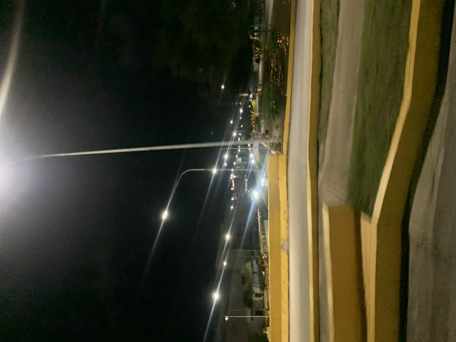 Night scene from an elevated position, likely a bridge or overpass, overlooking a street lined with streetlights. The right side shows the bridge's yellow guardrail, adjacent to a grassy area and a road surface. Further away, the street is visible with rows of streetlights stretching into the distance. In the background, some trees and distant buildings are illuminated. The sky is dark, creating a stark contrast with the bright streetlights.