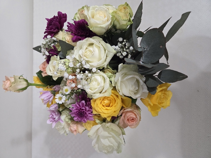 A floral bouquet is displayed on a light-colored surface within Rosebank, South Africa
