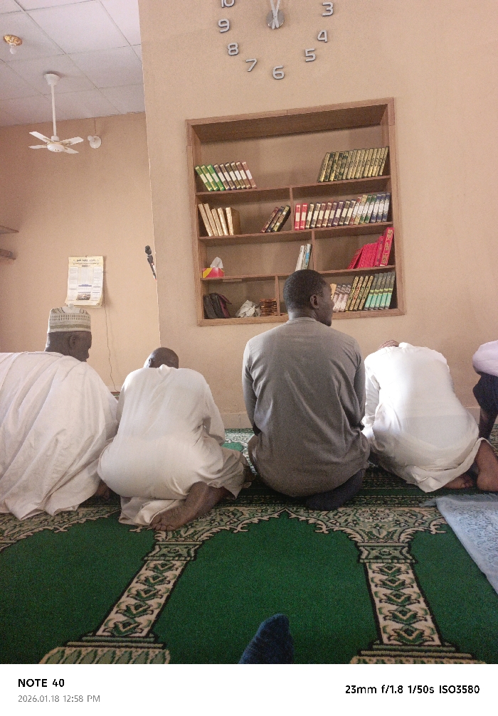 The image depicts an indoor scene within a mosque or prayer room in Tudun Wazurchi, Nigeria. Four adult males are observed from behind, kneeling or sitting on their heels on green prayer rugs. Three individuals on the left are dressed in white traditional robes; the leftmost man wears a white skullcap, and the second from the left is bald. The third man from the left, positioned centrally, wears a grey long-sleeved shirt and dark trousers. The fourth man on the far right also wears a white robe and is bowing his head. A fifth individual's foot, wearing a blue sock, is visible in the bottom right foreground, indicating the photographer's kneeling position. The room features light brown walls and a white grid-patterned ceiling. A white, three-bladed ceiling fan and a circular golden light fixture are mounted on the ceiling to the left. A large, frameless wall clock with silver numerals and hands, indicating approximately 12:58, is affixed to the upper right wall. Below the clock, a wooden bookshelf with multiple compartments is mounted, containing numerous books, predominantly Islamic texts with covers in green, gold, red, blue, and white. A white tissue box and a dark bag are also on the shelves. A white document with Arabic script, possibly a calendar or religious poster, is visible on the left wall, above a partially obscured black microphone on a stand. The floor is covered with green prayer rugs featuring intricate patterns of arches, pillars, and geometric designs in white and gold. The overall scene suggests a moment of prayer or religious study. The image metadata indicates it was captured on 2026.01.18 at 12:58 PM.