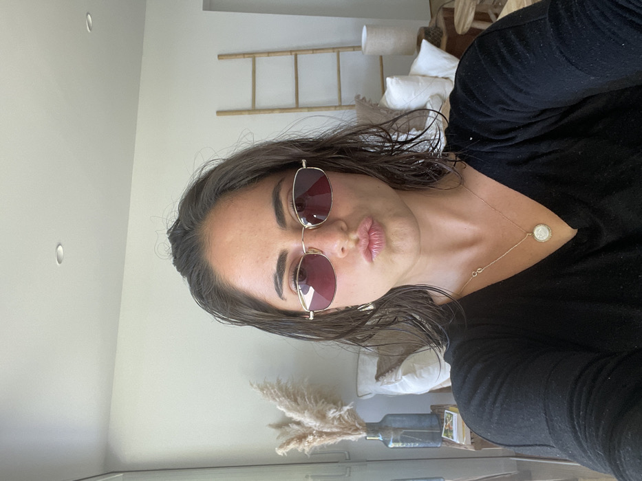 A female individual is depicted in a close-up, chest-up selfie taken indoors. She has dark, damp hair and wears a black V-neck top. Gold-framed, rectangular sunglasses with reddish-purple tinted lenses are worn on her face. A gold necklace with a circular white pendant is visible around her neck. Her lips are pursed in a "kissing" expression, and she looks directly at the camera. The background features light-colored walls and a ceiling with recessed spotlights. To the left, a dark blue vase containing dried pampas grass rests on a small wooden table, partially obscuring a light-colored sofa with a white cushion. A window or glass door is visible on the far left. To the right, a decorative bamboo ladder leans against the wall. Further back, another light-colored sofa with white cushions, a wooden side table with a lamp, and a smaller wooden stool are present. The specific location within Vilar, Spain, is not identifiable from the visual content.