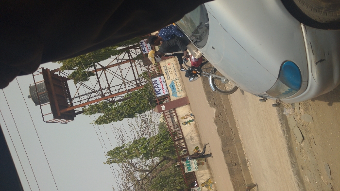 This image captures a daytime street scene in an unknown city and state. The photograph is taken from inside a vehicle, with the silver-grey front bumper and blue-tinted headlight of the observer's car visible in the lower right foreground; the bumper exhibits scuff marks. A dark, blurry shape, consistent with clothing, partially obscures the upper right. The midground features a dusty, light-colored road or path. On this path, a reddish-brown motorcycle with chrome accents is positioned. A male driver, wearing a yellow cap, a dark jacket, and a white face mask, operates the motorcycle, with a female passenger in a dark blue and white polka-dotted top seated behind him. To the left of the motorcycle, a male pedestrian in dark clothing walks from right to left along the path. Behind the path, a low wall, painted light brown at the base with white top sections and faded murals, runs horizontally. A metal fence tops this wall, to which several signs are affixed, including multiple white signs with blue text identifying "ICAN." In the background, a tall, reddish-brown metallic lattice-structure water tower, topped with a dark cylindrical tank, stands prominently. Numerous tall, slender green trees are scattered across the scene, with a bare-branched tree visible on the far left. The sky is a hazy, light grey, traversed by thin utility lines.