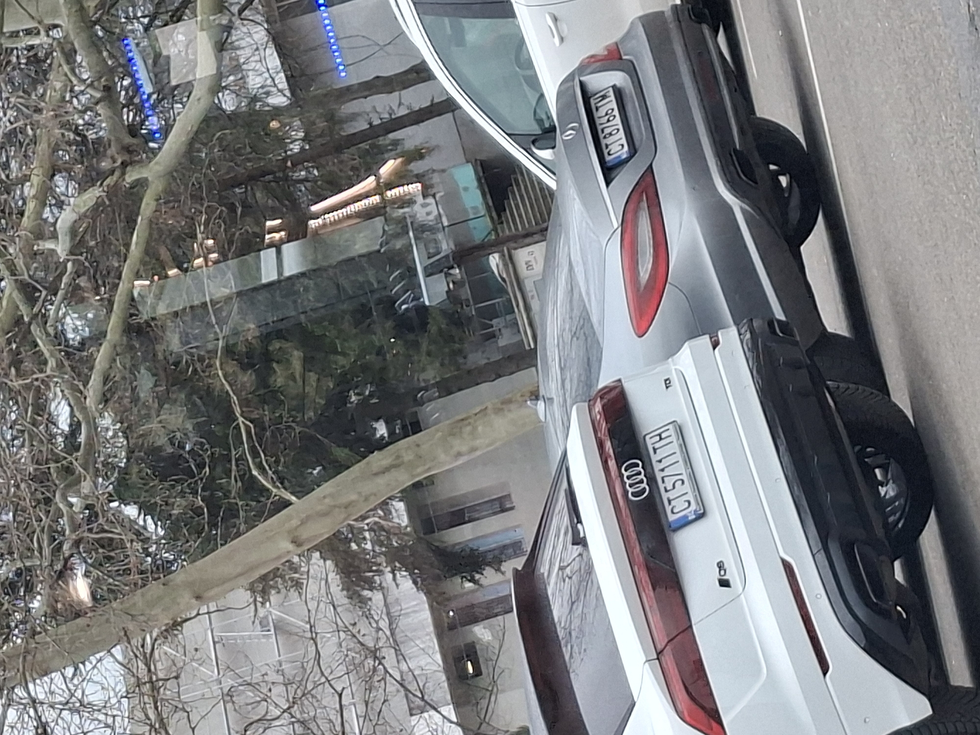 The image presents a street scene in Pavel Banya, Bulgaria, featuring three stationary vehicles. In the immediate foreground, positioned facing away, is a white Audi Q8 SUV displaying Bulgarian license plate "CT 5711 TH". To its right and slightly behind it is a grey Mercedes-Benz sedan, likely a CLS-Class model, bearing Bulgarian license plate "CT 8766 TM". A portion of a third white vehicle, possibly an SUV or van, is visible to the far right. The cars are parked on a paved surface. The background consists of a dense network of bare tree branches, indicative of a dormant season, and reflections revealing light-colored multi-story buildings, some with visible windows and at least one showing what appears to be scaffolding or a reflective facade. Blue LED strip lights are visible in the upper right background, along with a golden, cylindrical vertical object, possibly a decorative light fixture or monument. A set of exterior stairs leading to a building entrance is also discernible through the foliage and reflections. No individuals are visible.