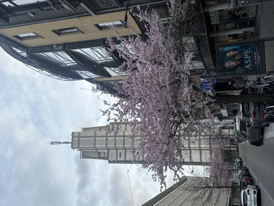The image displays a street scene in Antwerp, Belgium, looking towards the Boerentoren (KBC Tower). The Boerentoren, a tall, light-colored Art Deco skyscraper with vertical banding and a multi-level antenna array on its summit, stands prominently in the background under an overcast sky. In the mid-ground and foreground, several cherry blossom trees with abundant pink flowers line the right side of the street, with additional blossoming trees visible further down on the left. On the right, a multi-story building with a distinctive curved, tiered glass and dark metal facade is partially visible, adjacent to an older, darker building. On the left, a modern, light-colored building with horizontal elements runs parallel to the street. The paved street features numerous parked cars along both sides, primarily hatchbacks and SUVs. A bicycle is parked upright near a tree on the right sidewalk. A blue and white circular traffic sign and a black-framed advertising poster stand on the right sidewalk. The poster depicts an older man and woman, with the title "ASPE HET SLOTAKKOORD" and the release date "VANAFA 22 MEI 2020". Two individuals are visible on the sidewalks: one person in a light-colored hooded top walks away from the camera on the right, and another person is discernible walking on the left sidewalk further down the street. The scene is illuminated by diffuse daylight from the overcast conditions.