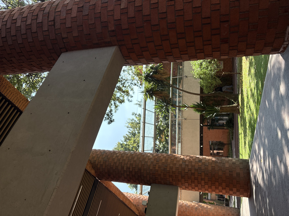 This image depicts an outdoor architectural space within the Ciudad Universitaria campus of the National Autonomous University of Mexico (UNAM) in Mexico City, Mexico. The scene is illuminated by bright daylight, casting shadows on the paved foreground. Two prominent, circular columns constructed from reddish-brown brick frame the view, supporting a large, light-grey concrete beam overhead. Above the beam on the left, a dark wooden slatted ceiling is visible. In the mid-ground, a meticulously maintained green lawn is present, adorned with several tall, slender, palm-like plants, one featuring a curved trunk, and other smaller green shrubs. A single individual, dressed in dark clothing, is visible walking from left to right on the far side of the lawn, partially obscured by the foliage. Above the lawn, an elevated pedestrian walkway with light-colored railings and a glass-paneled roof traverses the area. Beyond this structure, a building with red brick walls and horizontal window openings is visible. The upper background features a large glass skylight structure and a dense canopy of green trees against a clear blue sky.